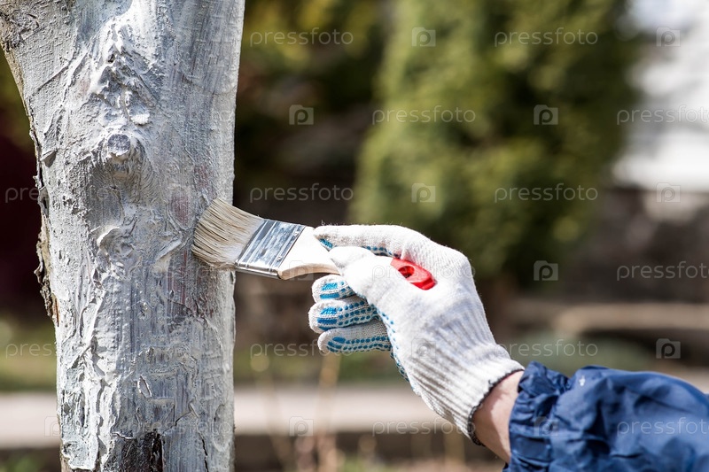 Весеннее садоводство. Побелка плодовых деревьев от насекомых и болезней. Ствол дерева и рука садовника с кистью и побелкой, красящая яблоню