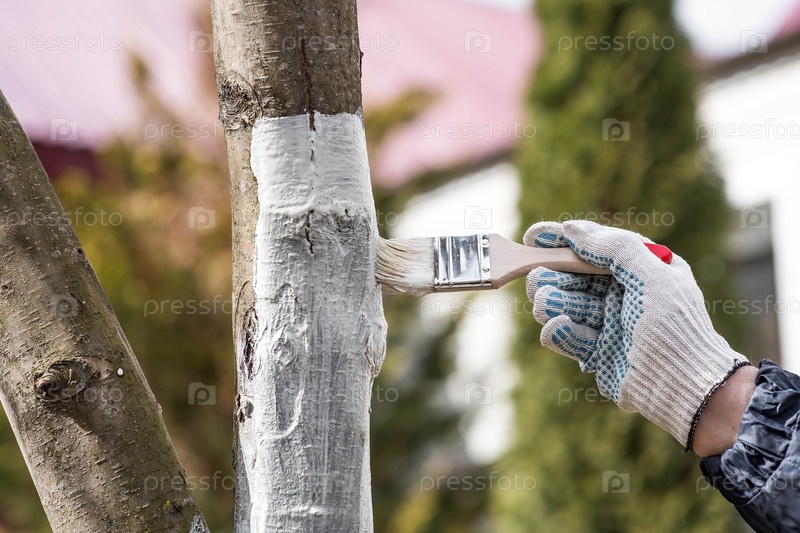Весеннее садоводство. Побелка плодовых деревьев от насекомых и болезней. Ствол дерева и рука садовника с кистью и побелкой, красящая яблоню