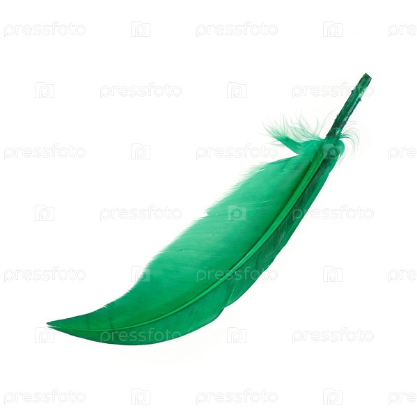 Ярко-зеленое натуральное перо птицы, изолировано на белом фоне
