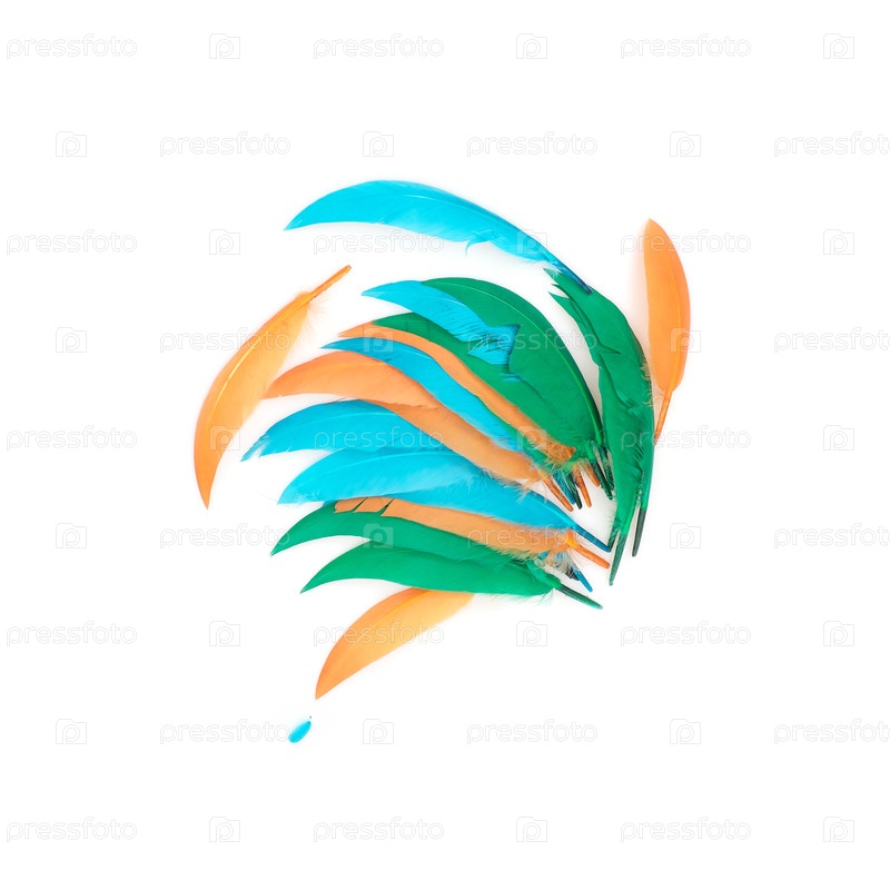 Яркое разноцветное птичье перо, изолированное на белом фоне