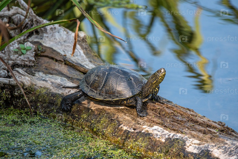 Черепаха сидит на упавшем дереве возле водоема и греется на солнце