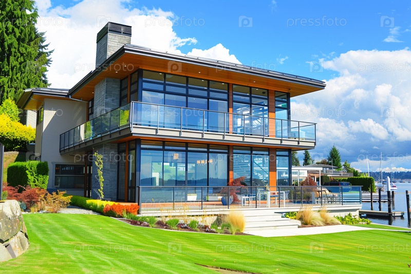 Элегантный современный дом на берегу озера с большими стеклянными стенами и пирсом
