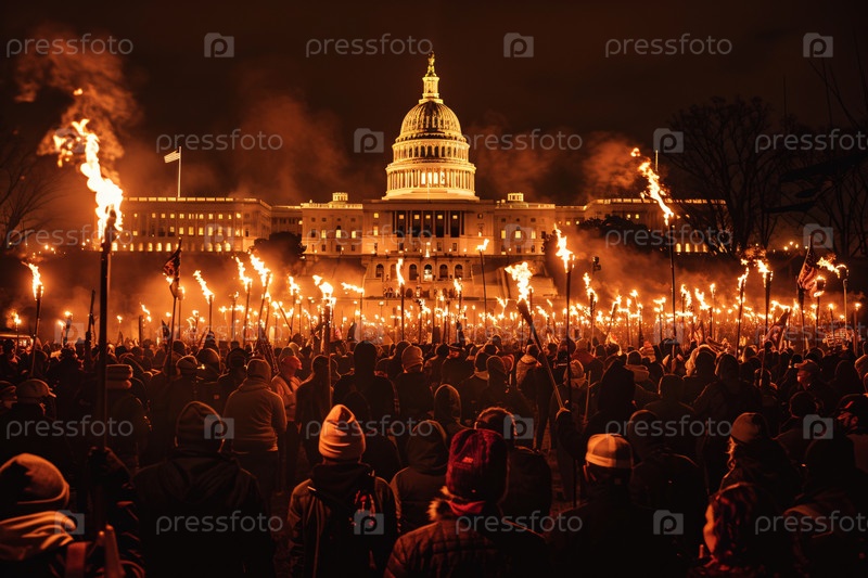 Ночной протест у Капитолия США с факелами и американскими флагами