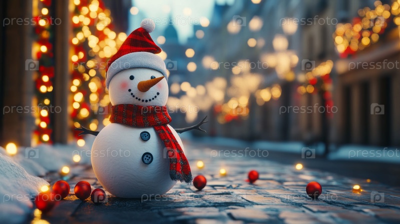 Веселый снеговик в красной шапке и шарфе украшает праздничную городскую улицу, освещенную светящимися огнями