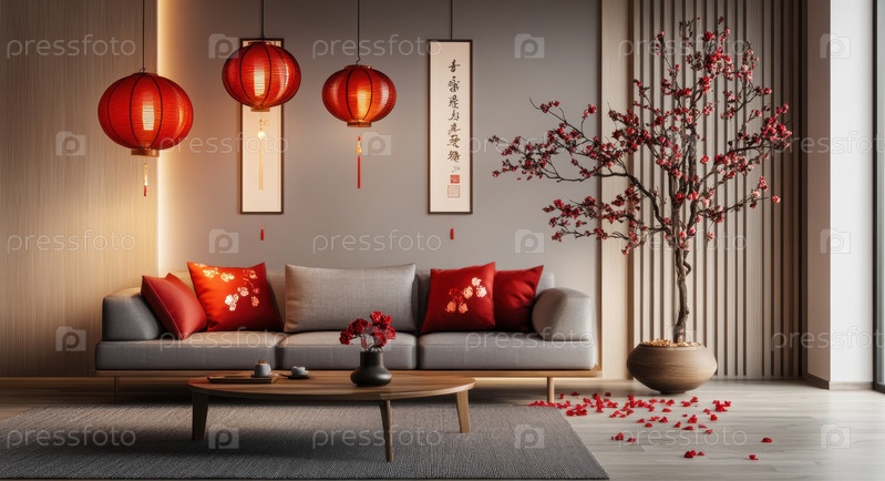 Современная гостиная в стиле дзен с красными фонарями и восточным декором
