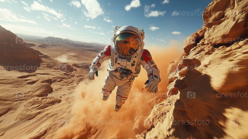 Астронавт падает в марсианской пустыне из-за пыльной бури