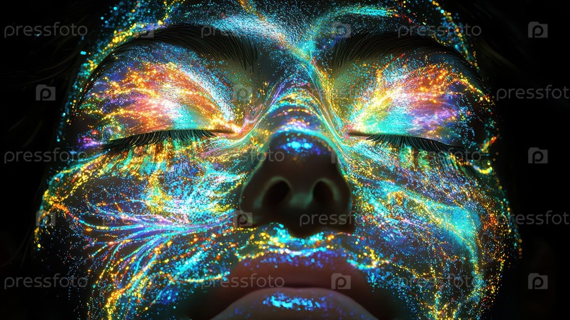 Крупный план женского лица с яркими неоновыми световыми эффектами