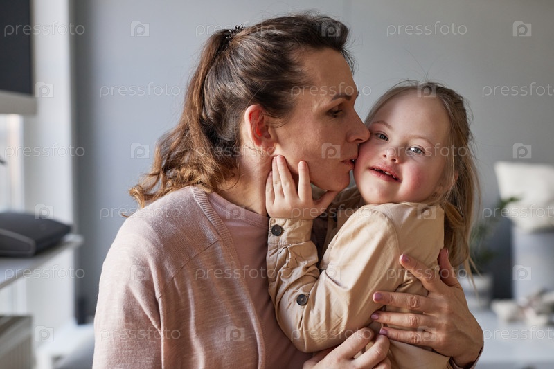 Любящая мать целует дочь с синдромом Дауна