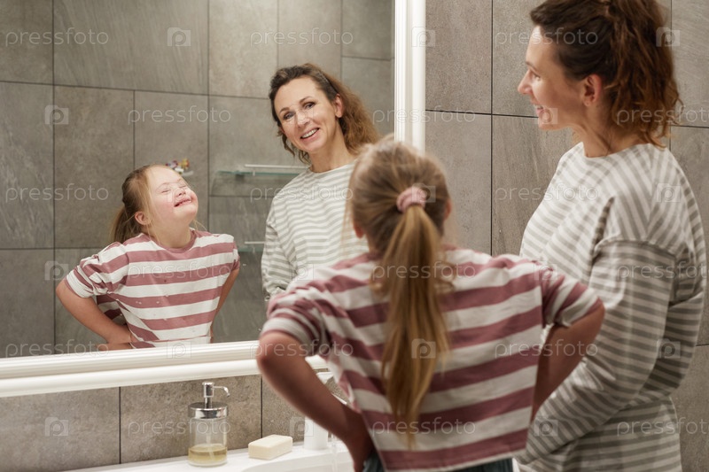 Улыбающаяся девочка с синдромом Дауна в ванной