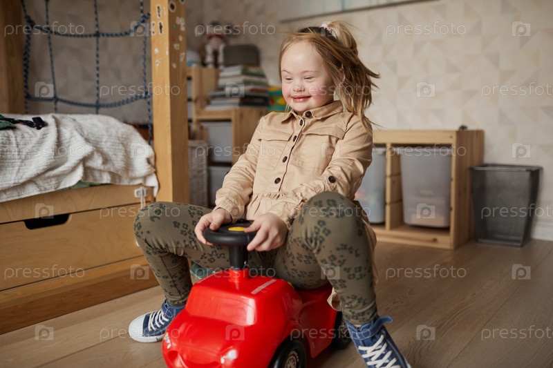 Милая девочка с синдромом Дауна играет дома