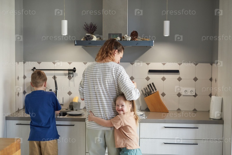 Одинокая мать с двумя детьми на кухне