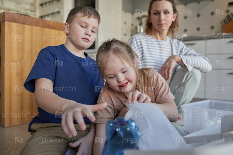 Девочка с синдромом Дауна сортирует пластик дома