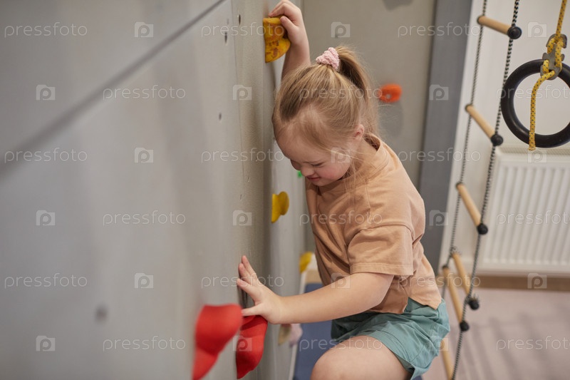 Девушка с синдромом Дауна, взбирающаяся на стену