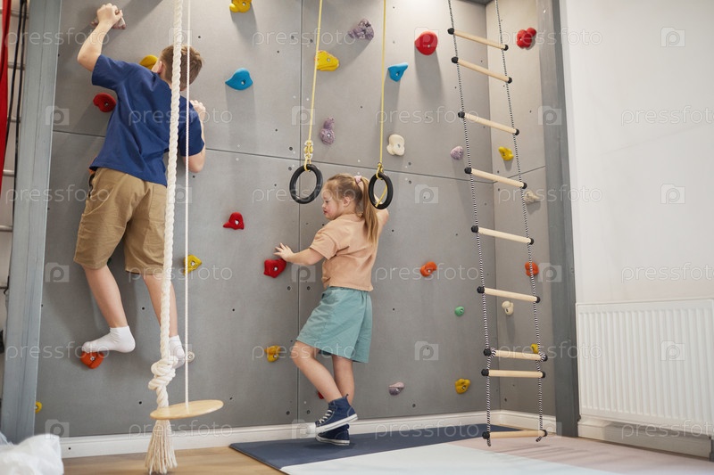 Мальчик и девочка взбираются на стену в домашнем спортивном наборе