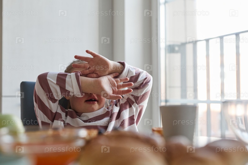 Девушка с синдромом Дауна прячется за обеденным столом