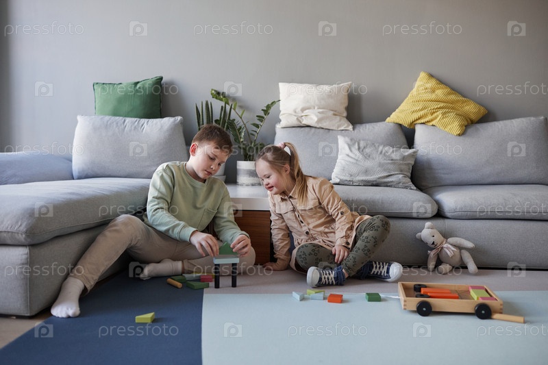 Брат и сестра с синдромом Дауна играют вместе