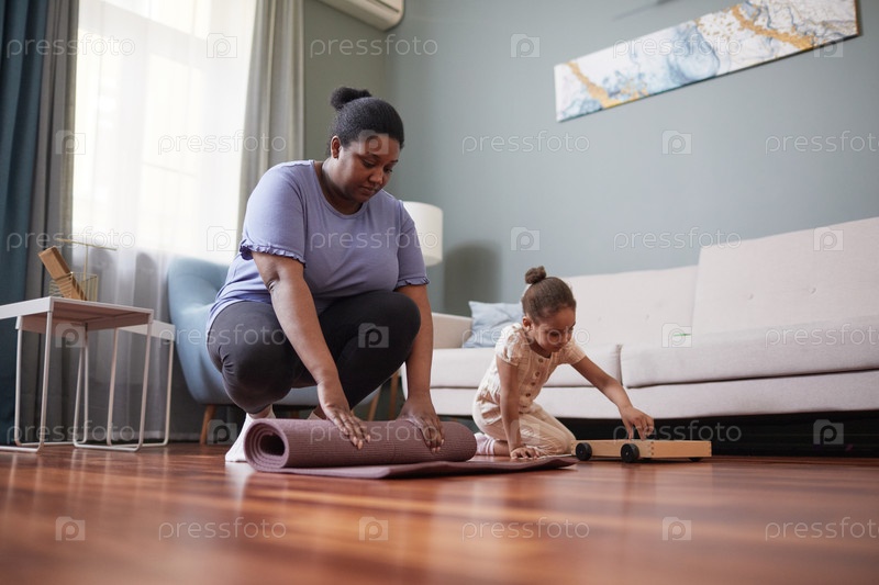 Мать-американец, разворачивающая йогу африканский мат