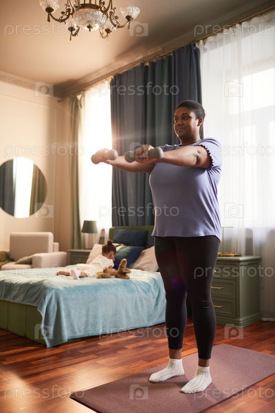Молодая мать поднимает гантели дома