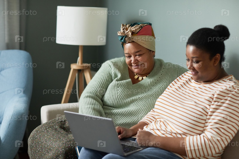 Афроамериканская мать и дочь используют ноутбук