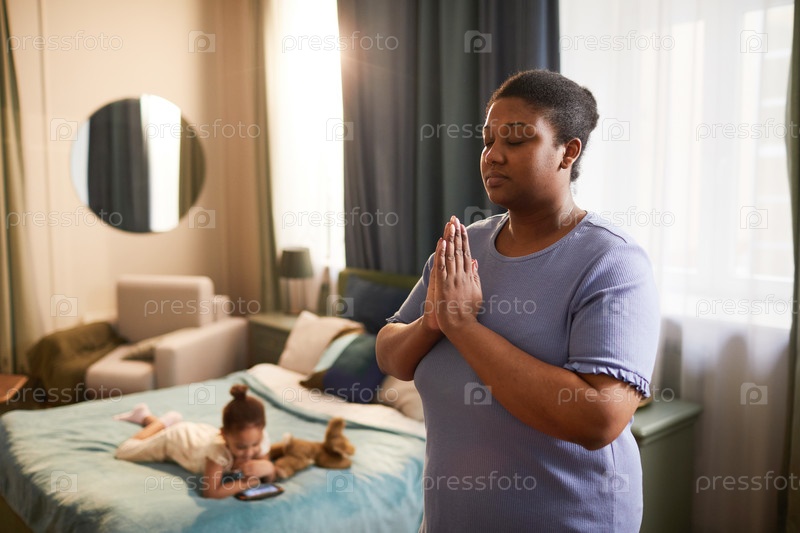 Афроамериканская женщина, медитирующая дома