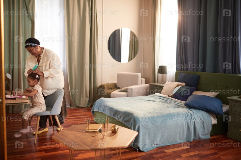 Бабушка расчесывает волосы маленьких девочек в уютной спальне
