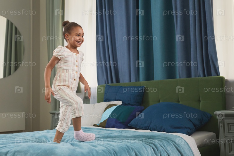 Маленькая афроамериканская девочка прыгает на кровать