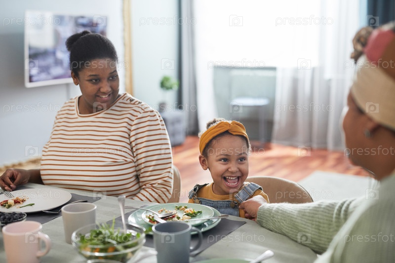 Счастливая афроамериканская девушка за обеденным столом
