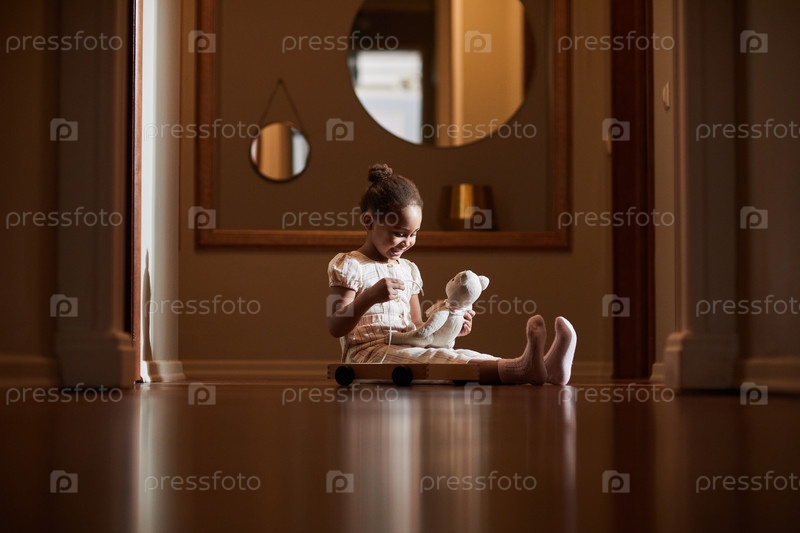 Афроамериканская девочка играет с маленьким игрушечным медвежонком
