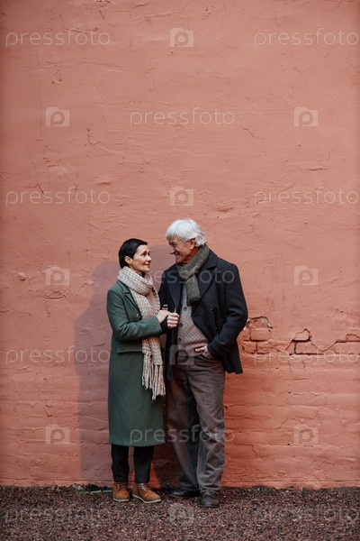 Пожилая пара, наслаждающаяся разговором на рустической стене