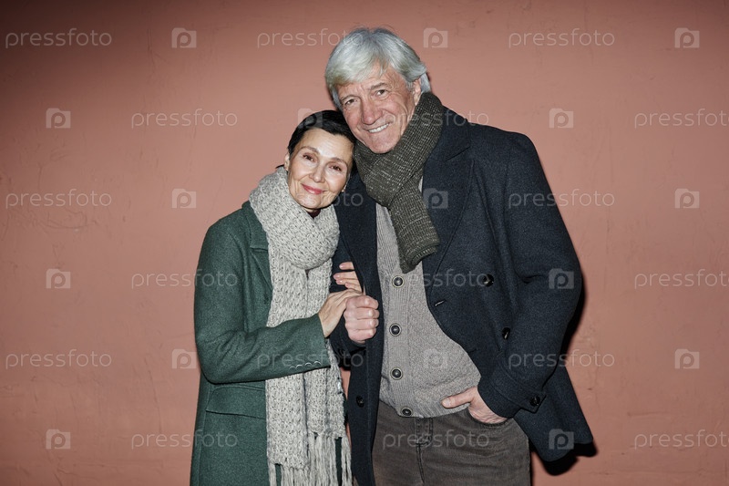 Улыбающаяся пожилая пара позирует в стильной зимней одежде