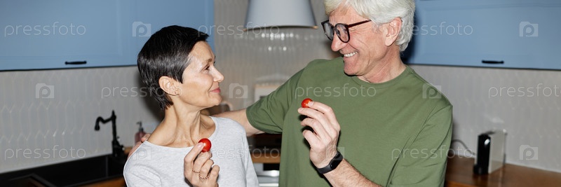 Header Image of Пара наслаждается вишневыми помидорами на кухне