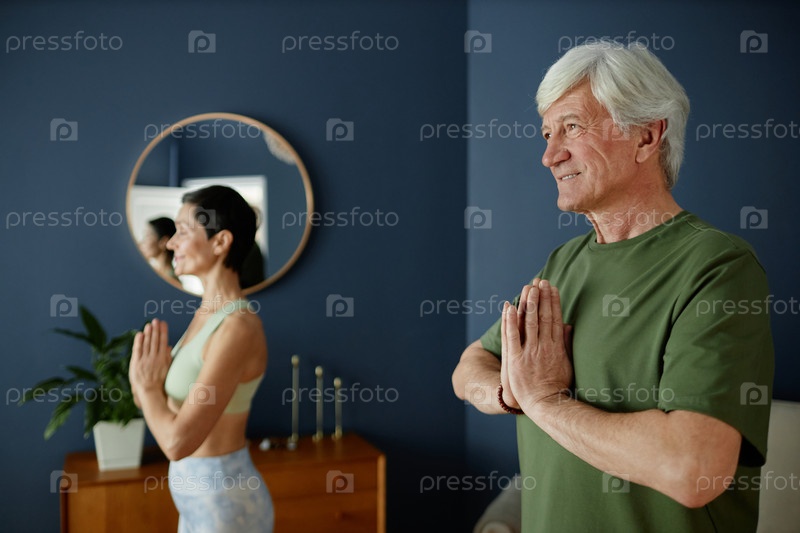 Практика йоги со старшим мужчиной, медитирующим в помещении
