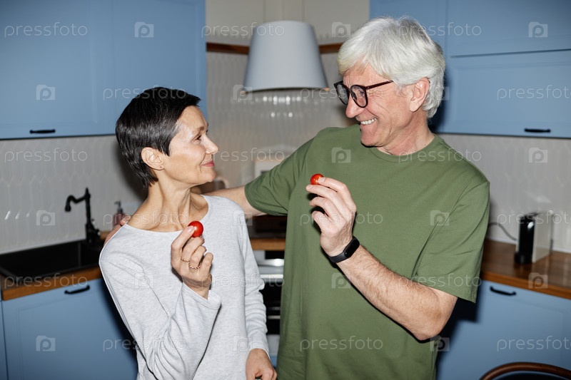Пожилая пара улыбается и держит вишневые помидоры на кухне