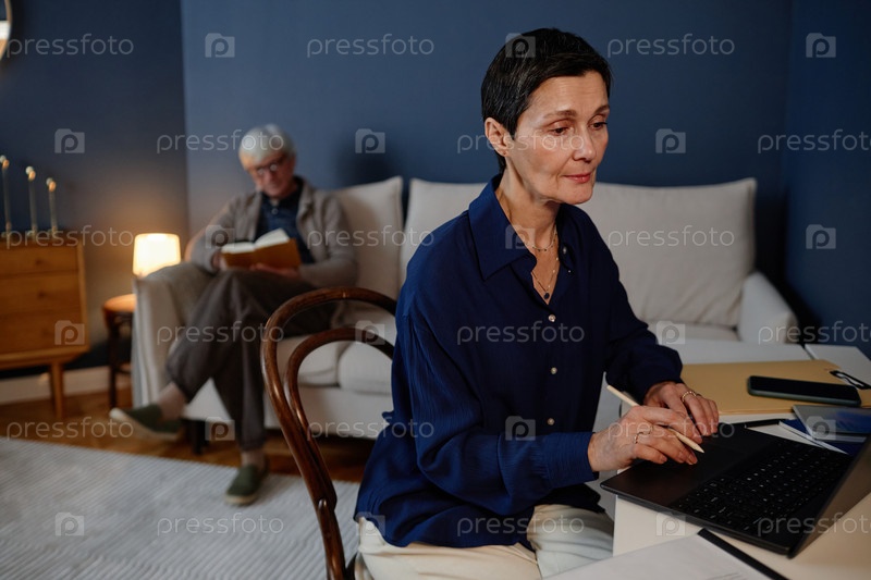 Портрет женщины, работающей на ноутбуке с сосредоточенным выражением лица