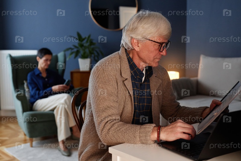 Портрет пожилого человека, использующего ноутбук в уютной гостиной