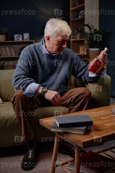 Пожилой мужчина открывает бутылку, сидя в гостиной