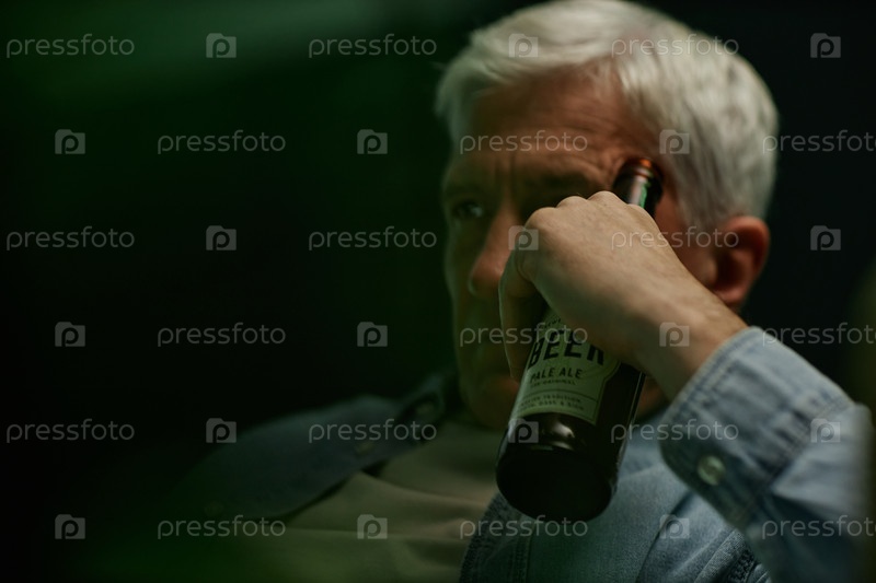 Пожилой мужчина пьет пиво в непринужденной обстановке