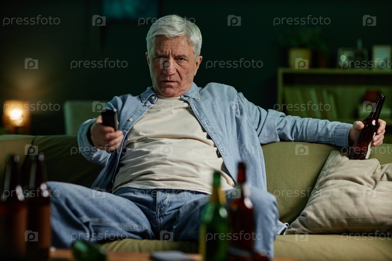 Портрет пожилого человека, сидящего на диване и держащего пульт дистанционного управления