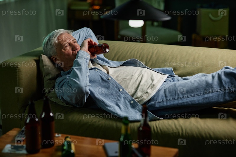 Расслабляющий старший отдыхает на диване и пьёт напитки