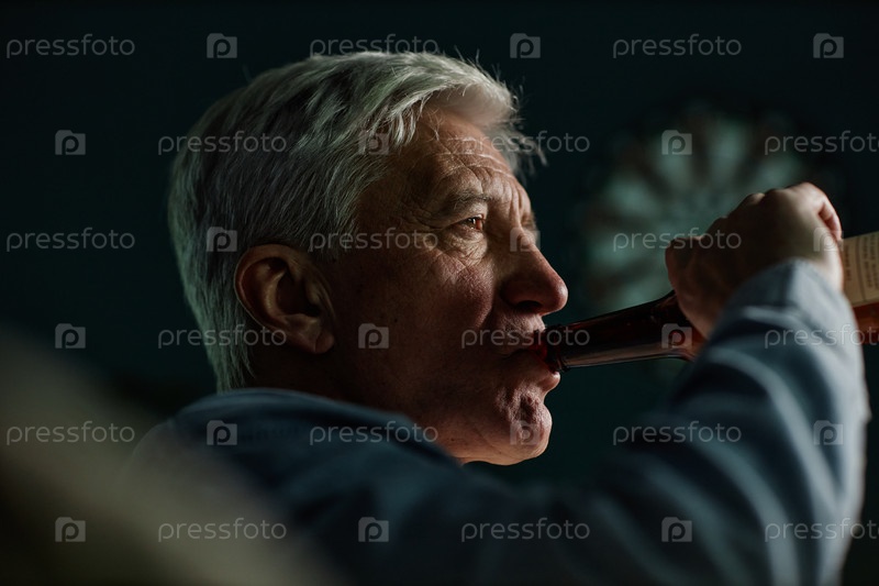 Пожилой мужчина пьет из бутылки с напитками