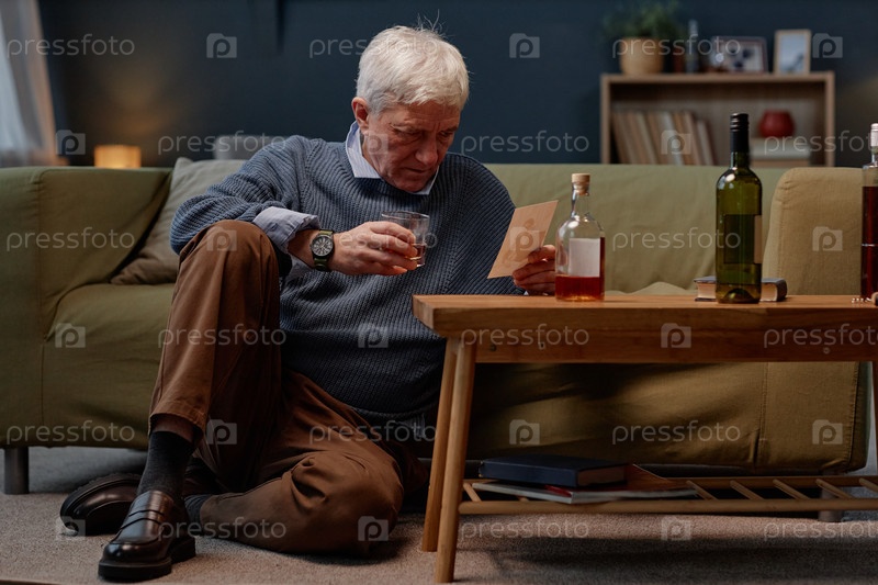 Пожилой человек читает письмо, сидя на диване