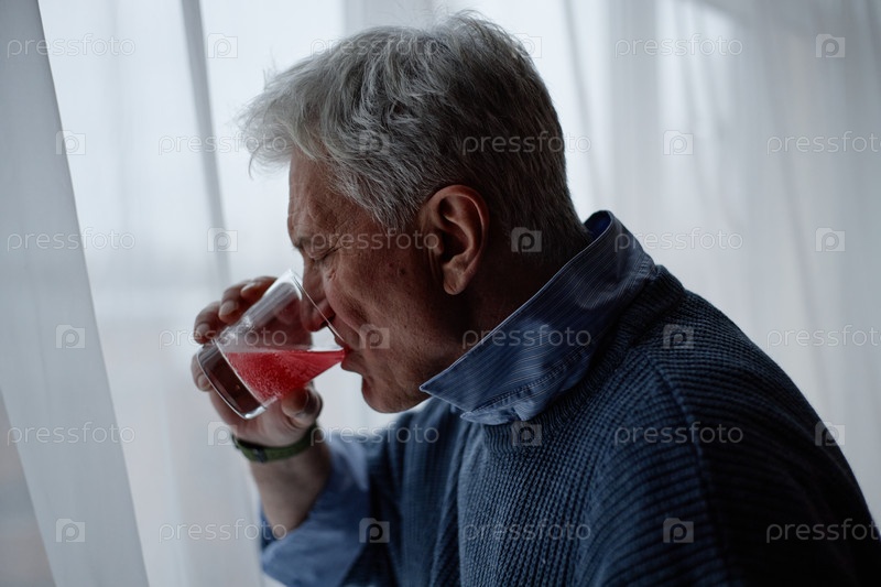 Пожилой мужчина пьет из красного бокала для напитков