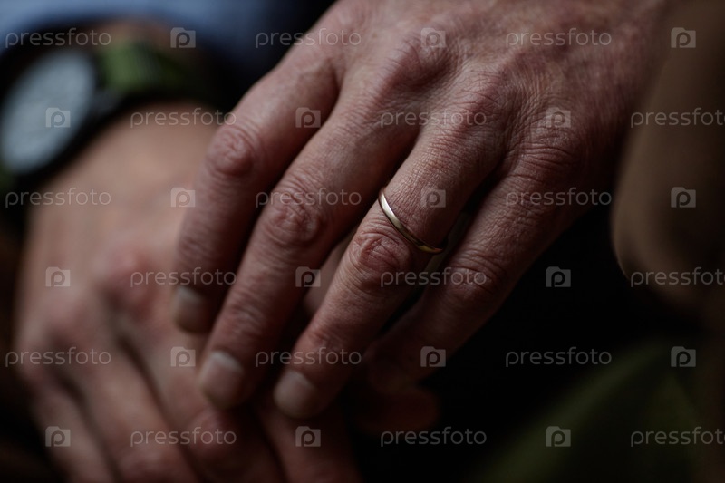 Удерживая руку пожилого человека с обручальным кольцом на темном фоне