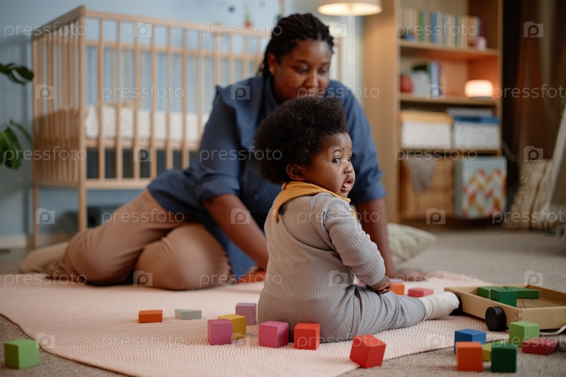 Девочка играет со строительными блоками, сидит на одеяле с мамой в спальне