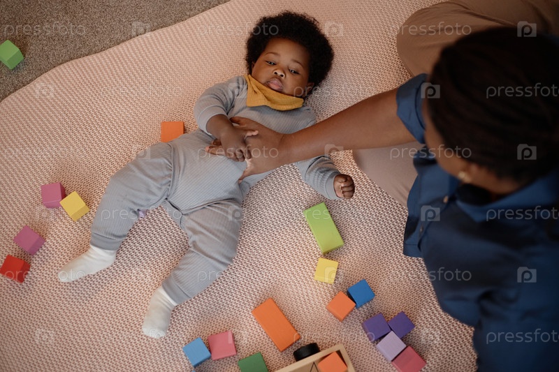 Черная девочка отдыхает на одеяле рядом с заботливой матерью, сидящей поблизости дома