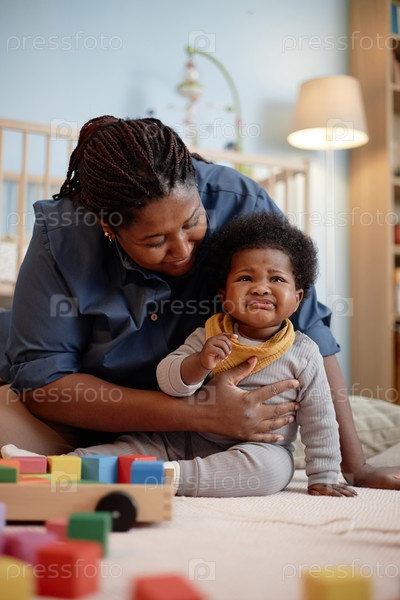 Черная мать утешает расстроенную девочку, сидящую на полу в спальне