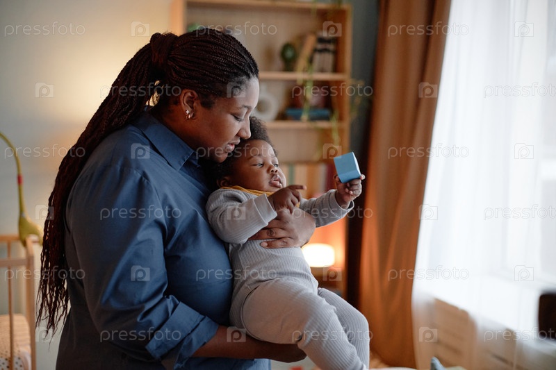 Черная мать держит маленького ребенка, засыпая дочерью в спальне