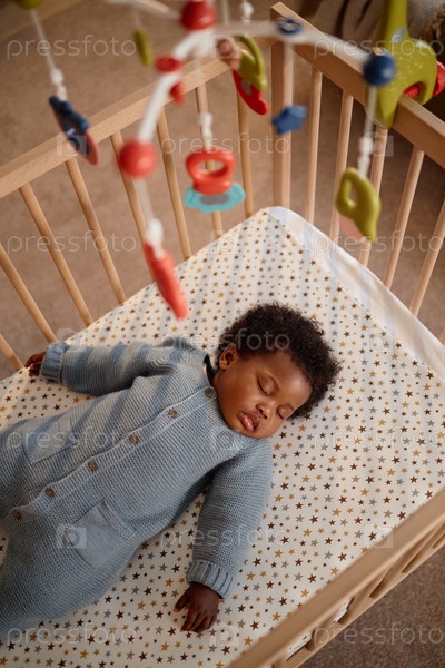 Спящая чернокожая девушка лежит в колыбели с мобильными телефонами, висящими над детским помещением