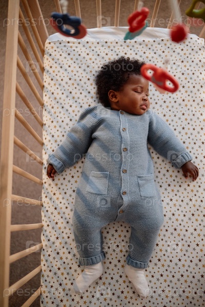 Девочка-ребенок, одетая в черный ромпер, спит в кроватке внутри