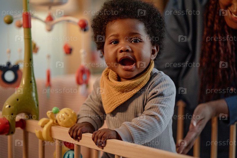 Черная маленькая девочка стоит внутри колыбели, в то время как мать засыпает ребенка дома